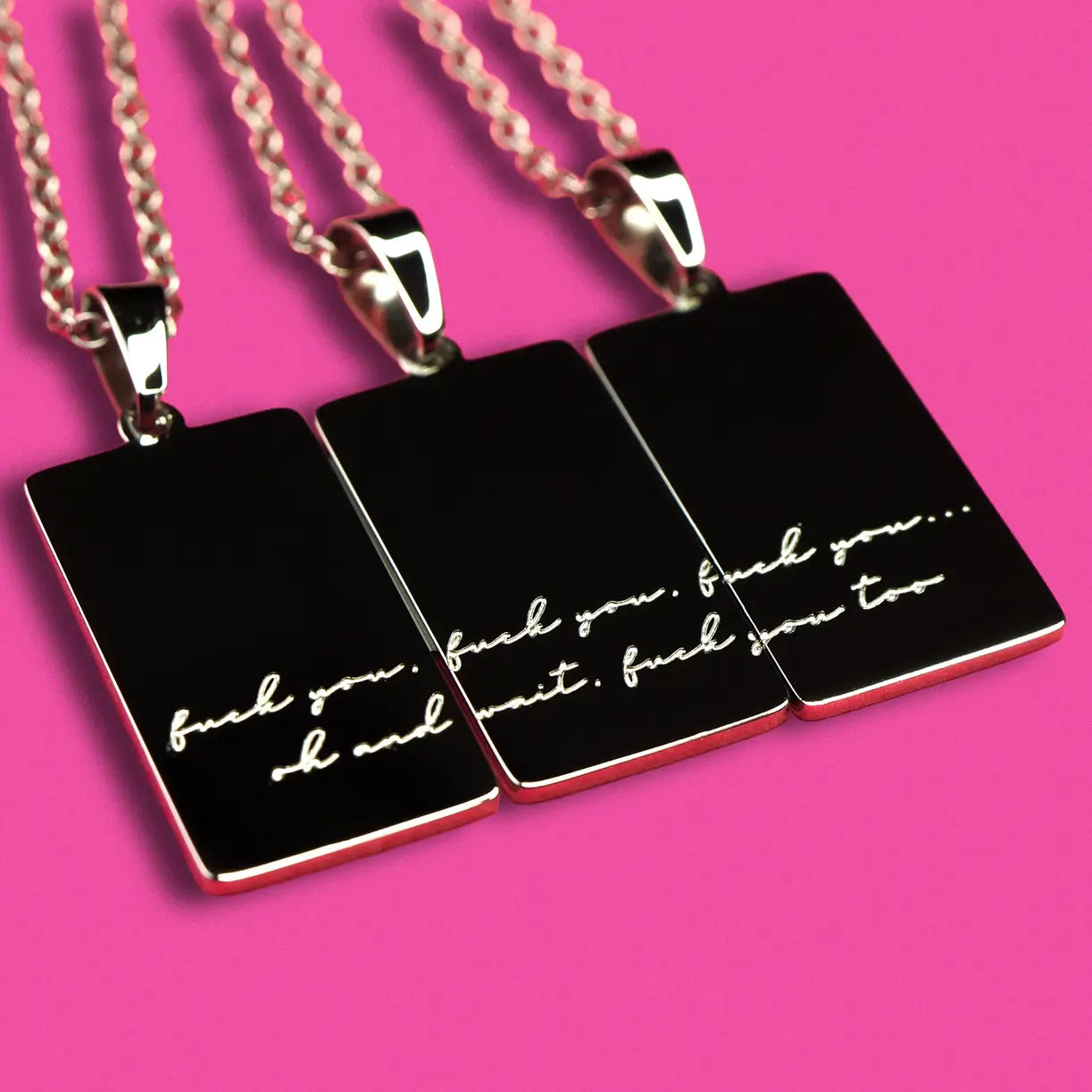 Best friends be like fuck you, fuck you, fuck you...oh and wait, fuck you too! Our minimalist 3 piece design reveals a no nonsense message when held together, making it the perfect inside joke only you and your besties will truly get.